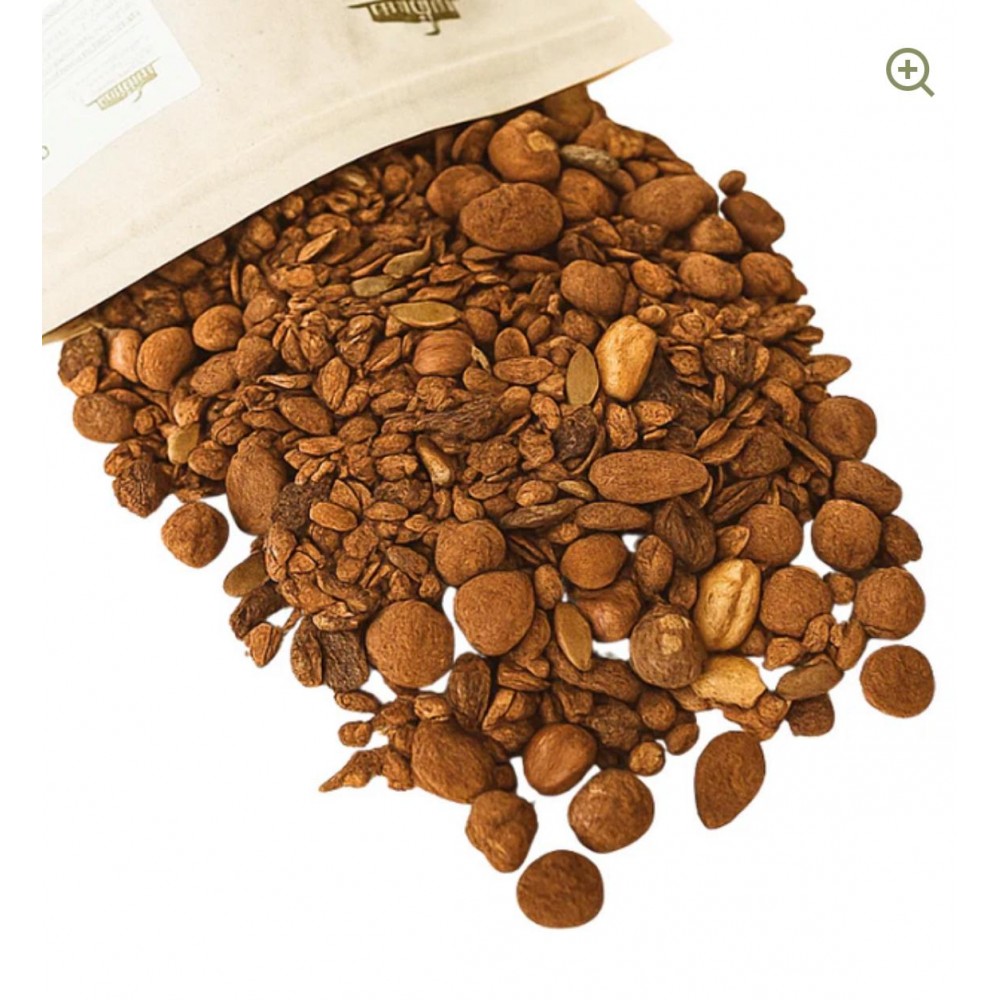 A crunchy and rich granola from Fattoria della Mandorla, created from a blend of whole grains, dried fruit, seeds, and organic cocoa.