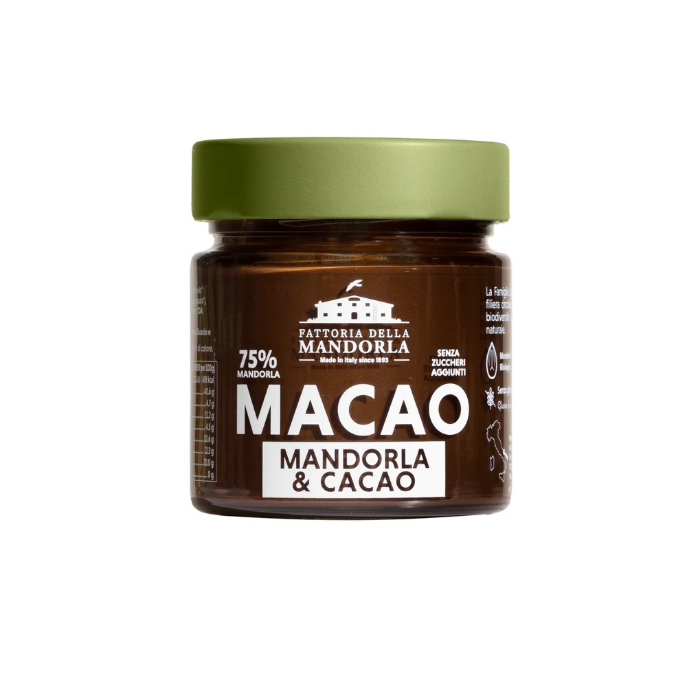75% organic almond cream with bitter cocoa and almond milk, no added oil or sugar.