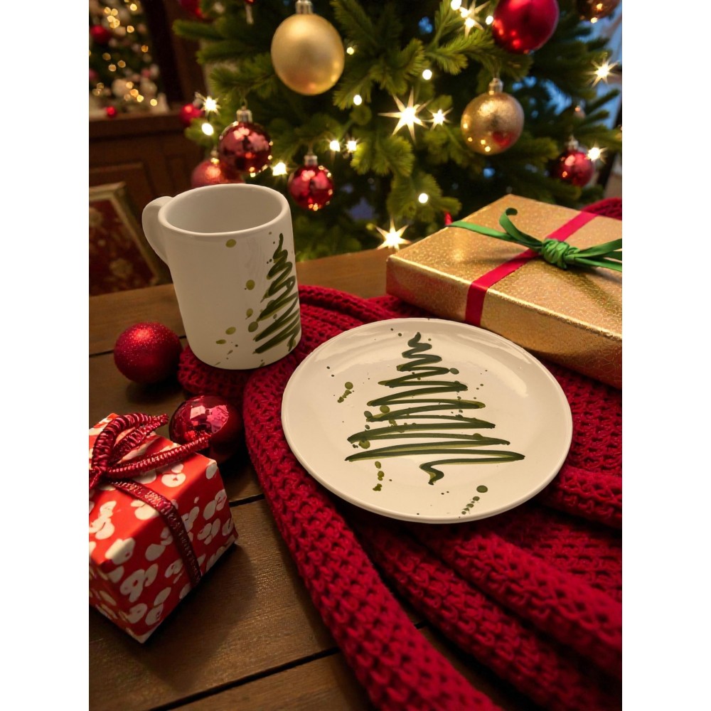 Rendi magico ogni risveglio delle feste con il nostro set colazione in ceramica pugliese, composto da tazza mug e piattino, entrambi dipinti a mano con un elegante albero verde.